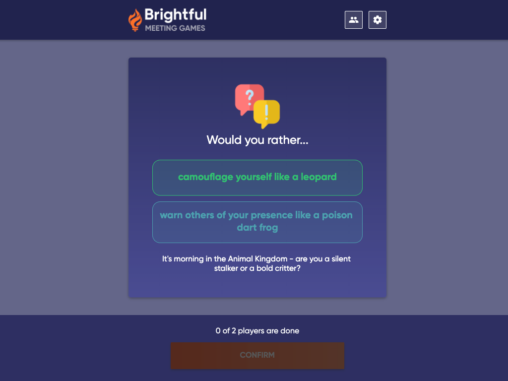 When it comes to conducting a session like this in a virtual environment, there are two options you can choose from. The first option is to pair up your team members or place them in small groups. That offers your team a chance to bond with each other and explain their responses. It can also lead to some great laughs and excitement overall.