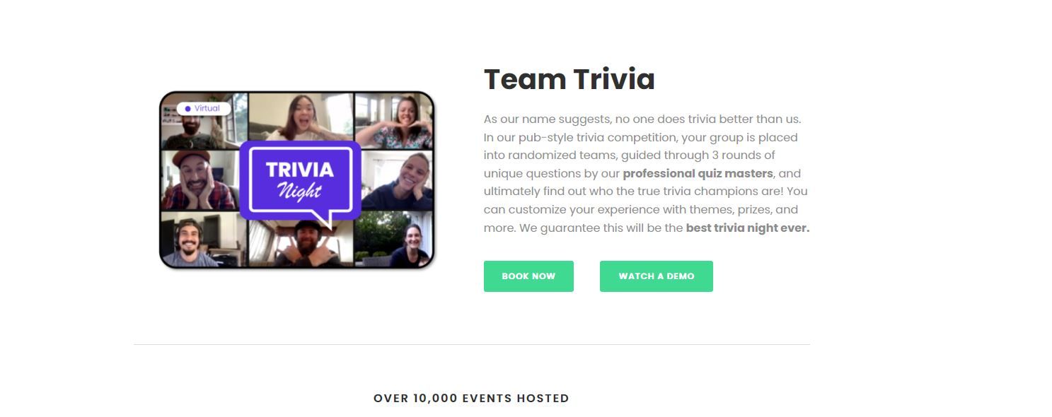 TriviaHub initially launched in 2019 and was created to make it easier for any remote team to host a virtual trivia night. They achieve this by driving engagement and entertainment. TriviaHub can host a gaming experience that effortlessly gathers your remote, hybrid, or in-person employees. All you need to do is choose from one of their excellent and passionate hosts to get started on your exciting night of Trivia.