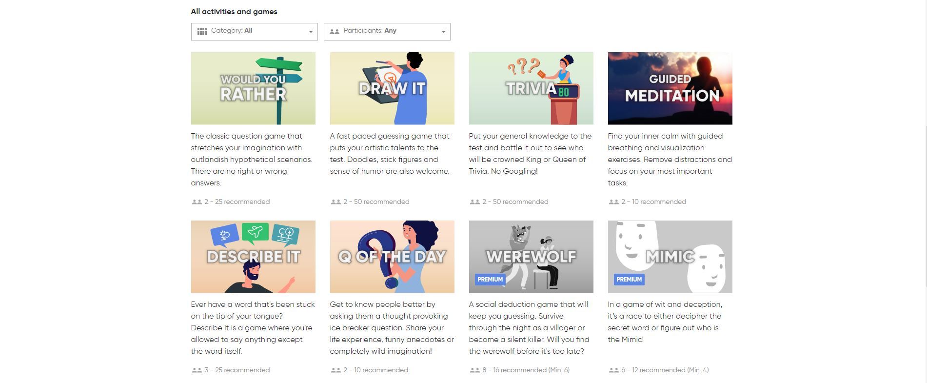 Brightful provides its users with a suite of games that increase engagement and social solidarity. Playing these games before the start of a meeting can improve communication and social interaction. Games like Draw It or Question of the day are designed to develop positive behavior such as teamwork. Similar to Kahoot, Brightful gives you the ability to customize the games, so you can create questions that match your specific needs. Host a quiz by including multiple-choice questions with Trivia, or play Describe it with a list of particular words. There is also a community of other Brightful users who share their content from all over the world.